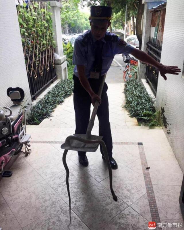 南都讯 记者杨婷 通讯员 祈福 近日,广州市番禺区祈福新邨小区的业主唐先生在家中上厕所时,发现来了“不速之客”,一条一米多长的灰黑色的小蛇,“天啊,吓死我了!”。祈福物业公司的两名保安接报后,手持棍子和铁锹,将蛇捕获后带到远离人群的深山放生。据了解,小区物业近日安排环卫部门对小区周边播撒硫磺进行驱蛇。